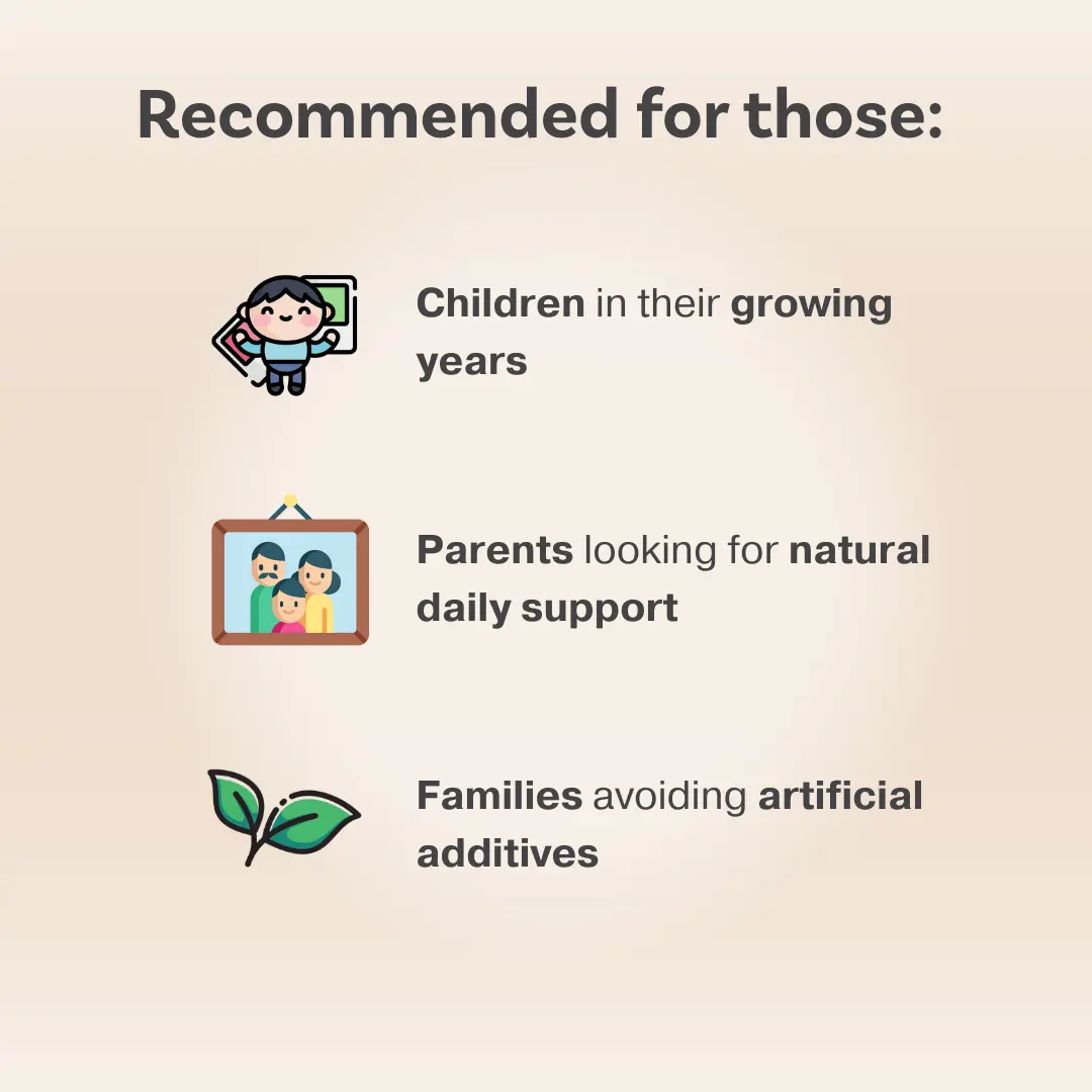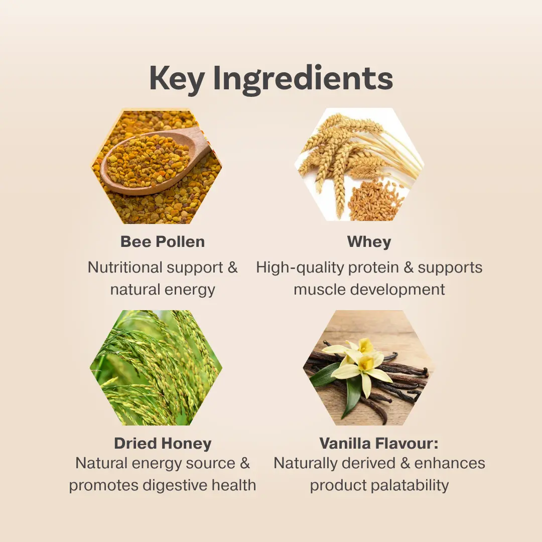 A natural daily boost made just for growing kids. This honey-vanilla chewable is packed with essential nutrients from bee pollen to support healthy development, focus, and immunity — in a form they’ll actually enjoy.
